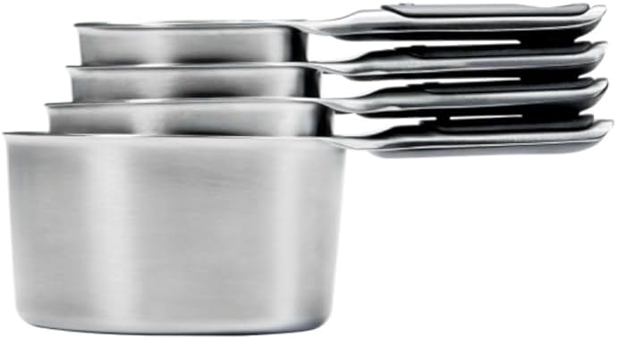 The OXO Good Grips Stainless Steel Measuring Cups are made from durable stainless steel, which enhances their longevity and reduces the need for frequent replacements. Their magnetic design allows for efficient storage and easy access, while the permanent, etched measurement markings prevent wear and tear from fading. This ensures that the product remains functional over time with minimal environmental impact. Additionally, stainless steel is highly recyclable at the end of the product's life, making disposal more eco-friendly.