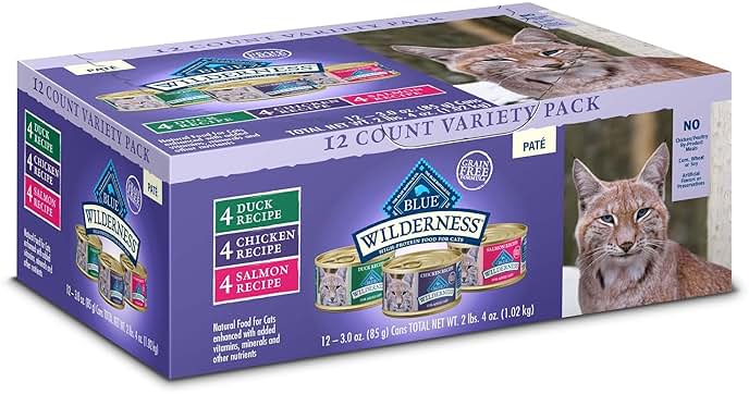 - Contains One (1) Variety Pack of BLUE Wilderness High Protein Grain Free, Natural Adult Pate Wet Cat Food, Chicken, Salmon, Duck 3-oz (12 count- 4 of each flavor)