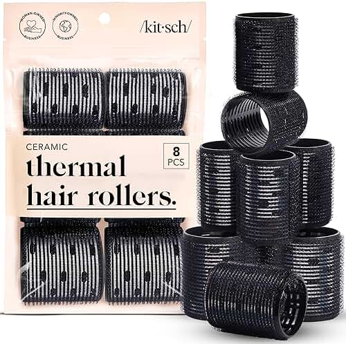 Kitsch Ceramic Thermal Hair Rollers for Women – Self Grip Hair Curlers for Heatless Curls Overnight - Volumizing Large Rollers for Short & Long Hair - For Long Lasting Frizz-Free Curls - Black, 8pcs