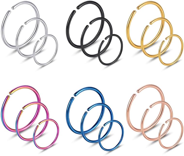 - One order includes 24 PCS of rose gold, gold, silver,black,blue,colorful nose rings .Gauge Size: 20G =0.8mm, inner diameter 6mm, 8mm,10mm,12mm.