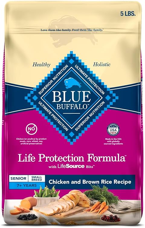 - Contains: One (1) 5-lb trial-size bag of BLUE Life Protection Formula Small Breed Senior Dry Dog Food, Chicken and Brown Rice Recipe