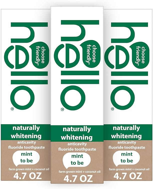 hello Naturally Whitening Fluoride Toothpaste, Natural Whitening Toothpaste with Coconut Oil and Tea Tree Oil, Tames Bad Breath, Helps Moisturize, and Fights Cavities, Mint, 3 Pack, 4.7 Oz Tubes