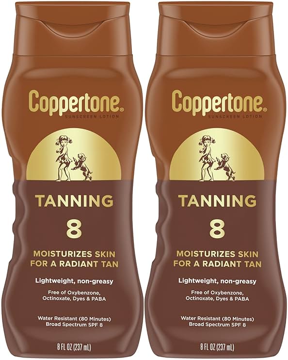 - INCLUDES: Two 8 fluid ounce bottles of Coppertone SPF 8 Tanning Sunscreen Lotion