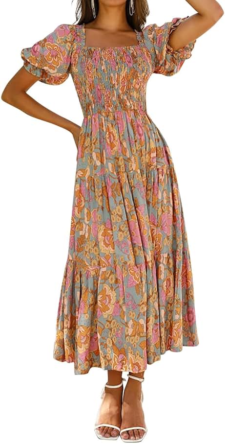 - Women maxi dress,Fashionable elastic square neck design with special floral print, A line dress with cute elastic puff short sleeve, Beautiful Long dress with ruched bust and flowy hem. Which make you more feminine and charming.