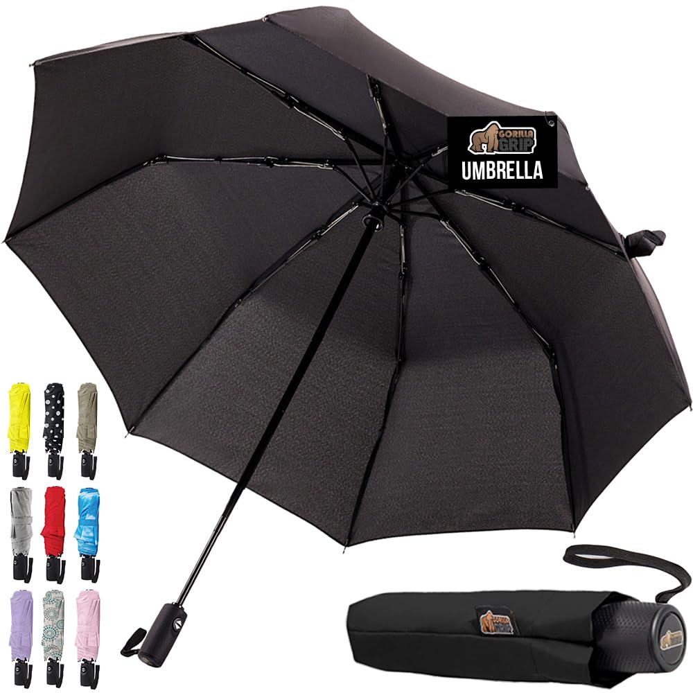 GORILLA GRIP Windproof Compact Stick Umbrella for Rain, Travel One-Click Automatic Open and Close, Lightweight, Portable, Strong Reinforced Fiberglass Ribs, Easily Collapsible, Black