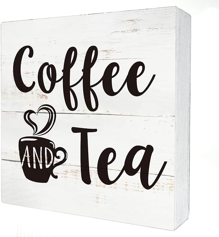 Coffee and Tea Wood Box Sign Kitchen Home Decor, Rustic Funny Coffee Wooden Box Sign Block Plaque for Wall Tabletop Desk Decoration