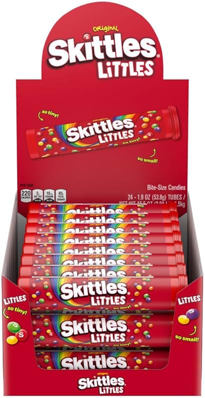 - Contains twenty-four (24) 1.9-ounce mega tubes of SKITTLES Littles Chewy Candy Assortment