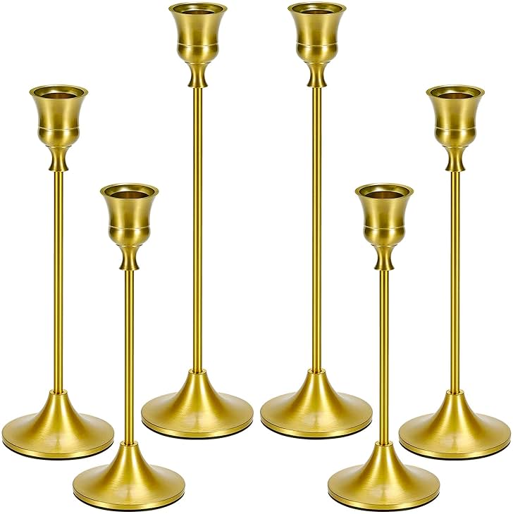 - Package Included】There are a total of 18 accessories, which able to assembling 6 brass golden candlestick holders, excluding candles. These 6 assembled gold candle stick holders available in 3 different sizes (W x H), each size is 2 pcs. S: 2.63 x 7.32 inches (66.8 x 186 mm), M: 2.63 x 8.5 inches (66.8 x 216 mm), L: 2.63 x 9.68 inches (66.8 x 246 mm). If the goods you received are missing any accessories or have been used, please contact immediately for an exchange.