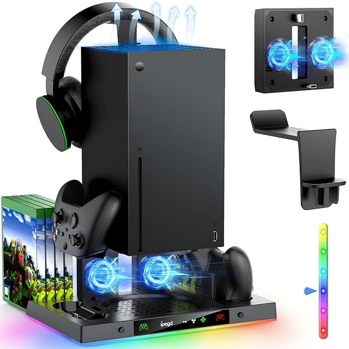 - [Multifunctional RGB Charging Station for Xbox X]:-----Upgraded cooling fan stand for Xbox Series X comes with console cooling fan, dual controller charger, 15 RGB lighting effects, 2 expansion card slots & 8 game card slots, headset hanger & extra USB port, integrating organizer, charging, cooling and gaming lighting ambiance. Ideal accessory for Xbox X gaming enthusiasts. (You will get: 1* RGB Charging Station for Xbox X; 1* Cooler Fan Stand; 1* Headset Hanger; 1*Use Manual.)