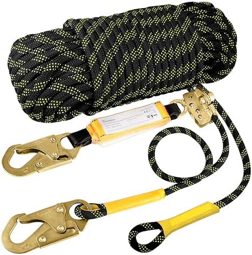 TRSMIMA Rope Harness Safety Lanyard:50ft Vertical Roofing Rope with Grab Snap Hooks Shock Absorber - Fall Protection Tree Climbing Line Kit Heavy Duty Roof Safety Equipment ANSI CE