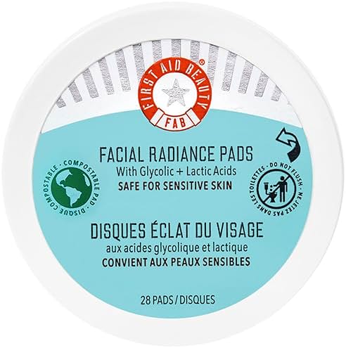 First Aid Beauty - Facial Radiance Pads with Glycolic & Lactic Acids, Daily Exfoliating Pads with AHA, Visibly Smaller Pores, Help Tone & Brighten Skin, One-Step Makeup Prep, Compostable, 28