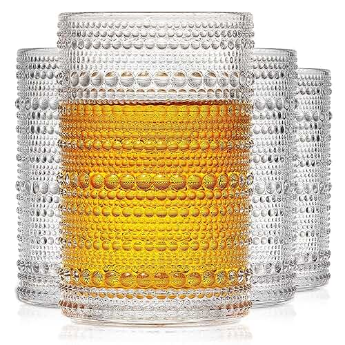 OPAYLY hobnail drinking glasses Highball Glasses Set of 4 12oZ Embossed Vintage Drinking Water Cocktail Whiskey Beverages Juice Milk Soda Gift for Men Women