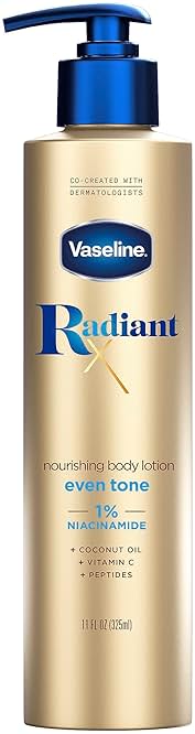 - POWERED BY SCIENCE: Vaseline Radiant X Even Tone Nourishing Body Lotion contains 1% niacinamide, coconut oil, vitamin C, peptides, and ultra-hydrating lipids that fortify the skin barrier.
