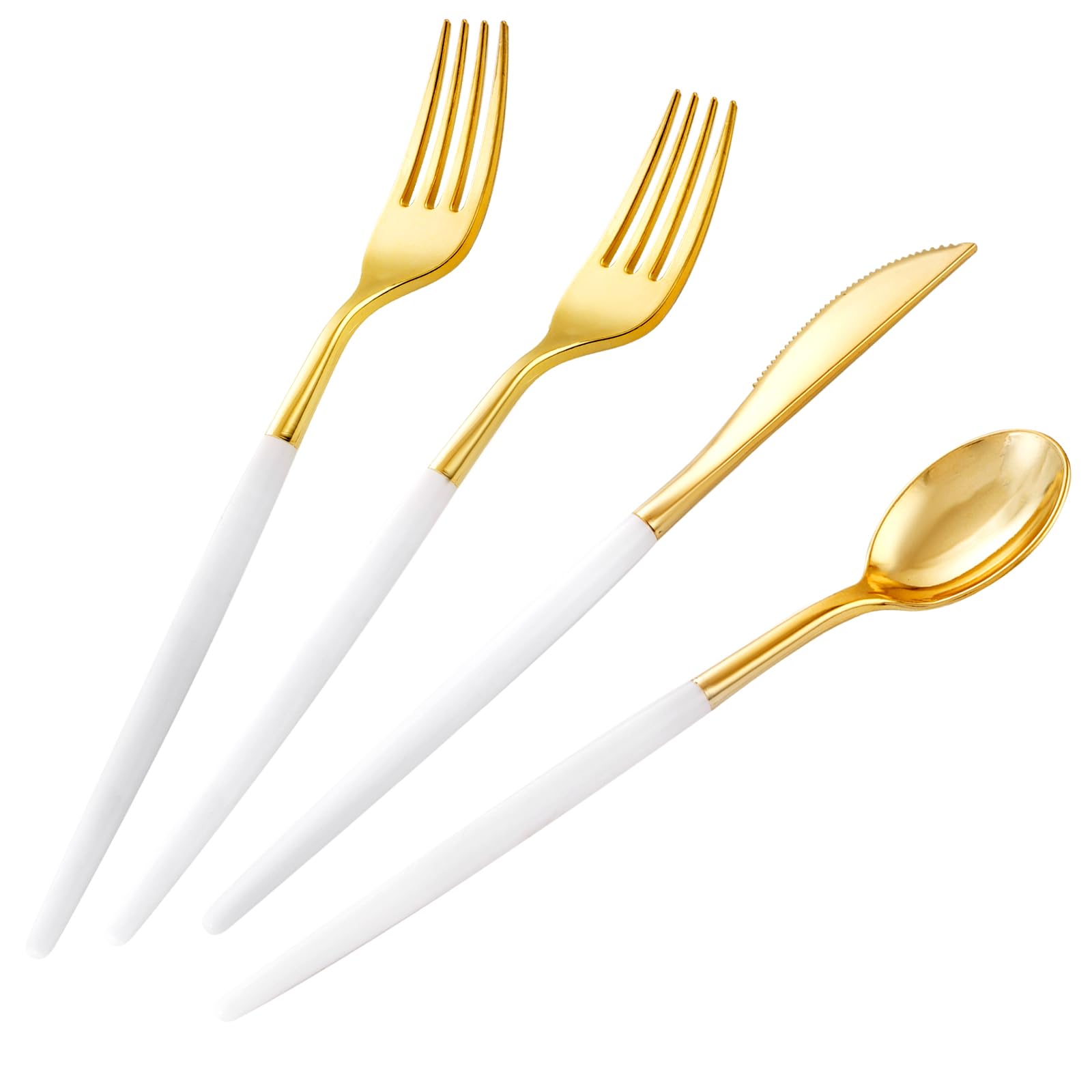 - 【ELEGANT WHITE GOLD DESIGN】Featuring an elegant white and gold combination, our gold silverware disposable adds a touch of class to any occasion. The gold finish elevates this plastic cutlery set above others, making it a perfect choice for birthdays, weddings, or baby showers. It effortlessly enhances the overall décor and creates a visually appealing table setting.