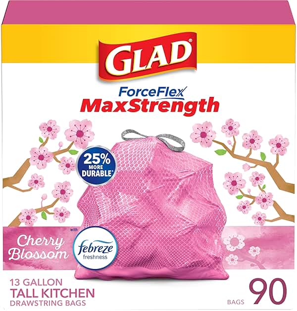 Glad Tall Kitchen Trash Bags 13 Gallon, MaxStrength Cherry Blossom Garbage Bags, Drawstring, 90 Count