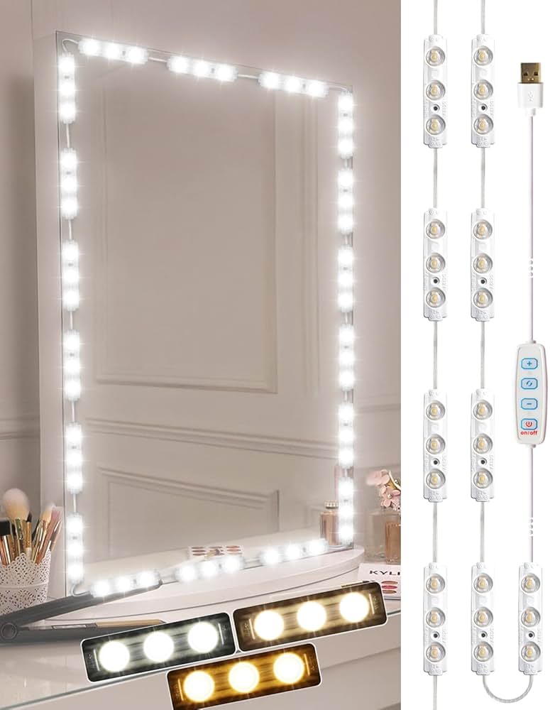 The DLOMT Vanity Lights boast LED technology that is energy-efficient and long-lasting, with a lifespan of 50000 hours. The product's brightness can enhance makeup application without flickering, utilizing 108pcs LED chip light beads for improved lighting. The lights have three color temperature options to mimic natural light, promoting better makeup application. The self-adhesive backing makes installation easy and does not require special tools. USB power source offers flexibility and convenience.