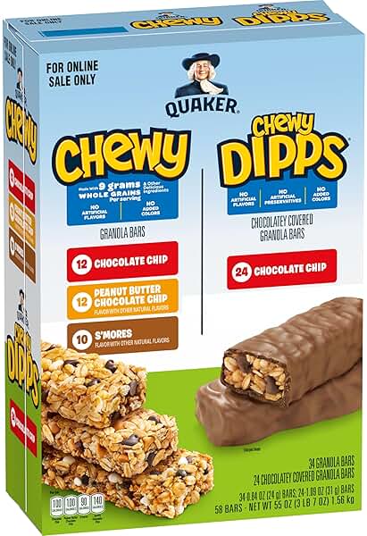 - Quaker Chewy Granola Bars, Chewy & Dipps 4 Flavor Variety Pack includes (24) Chewy Dipps Chocolate Chip, (12) Chewy Chocolate Chip, (12) Peanut Butter Chocolate Chip, (10) Smores flavors