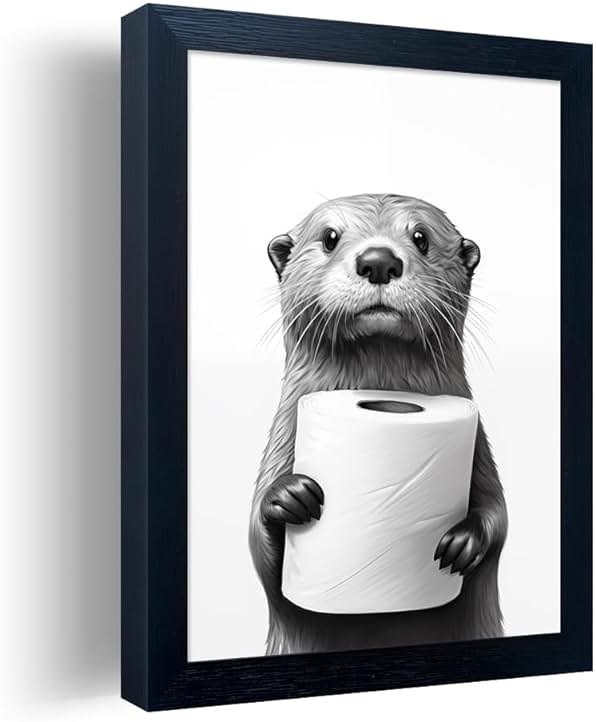 Bathroom Picture Wall Decor, Framed Black and White Bathroom Wall Art, Toilet Paper in Little Funny Raccoon's Hand Animal Canvas Print Painting